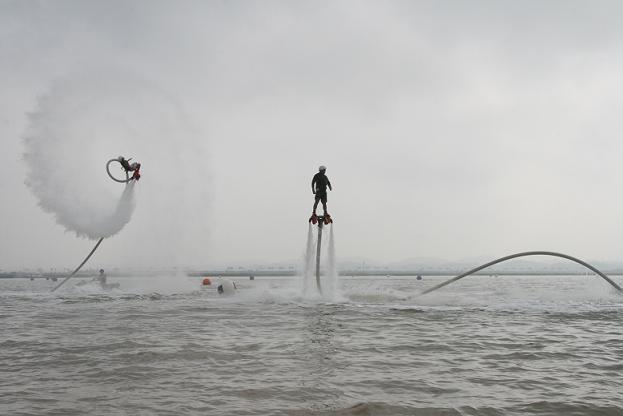 当天上午,在简短的开幕启动仪式后,进行了水上飞人花样表演,引来观众阵阵欢呼声。